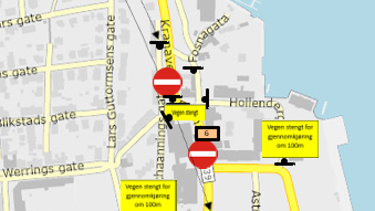 Stengte veier fra mandag av Fylkesveg 539 og kommunal vei (KV9450) Stallbakken/Prost Schaannings gate stenges samt at Hollendergata er stengt fra før. Publisert 07.11.2025 kl. 13:26