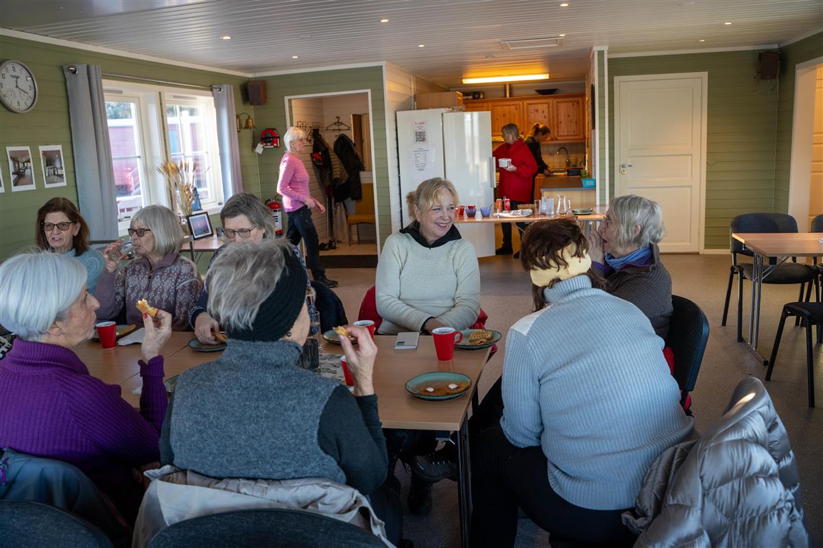 Lisbeth Hultgren, ca midt i bildet, er spreke seniorer instruktør - og har turgruppe hver tirsdag. De kommer da innom Møteplassen for kaffe og vafler.