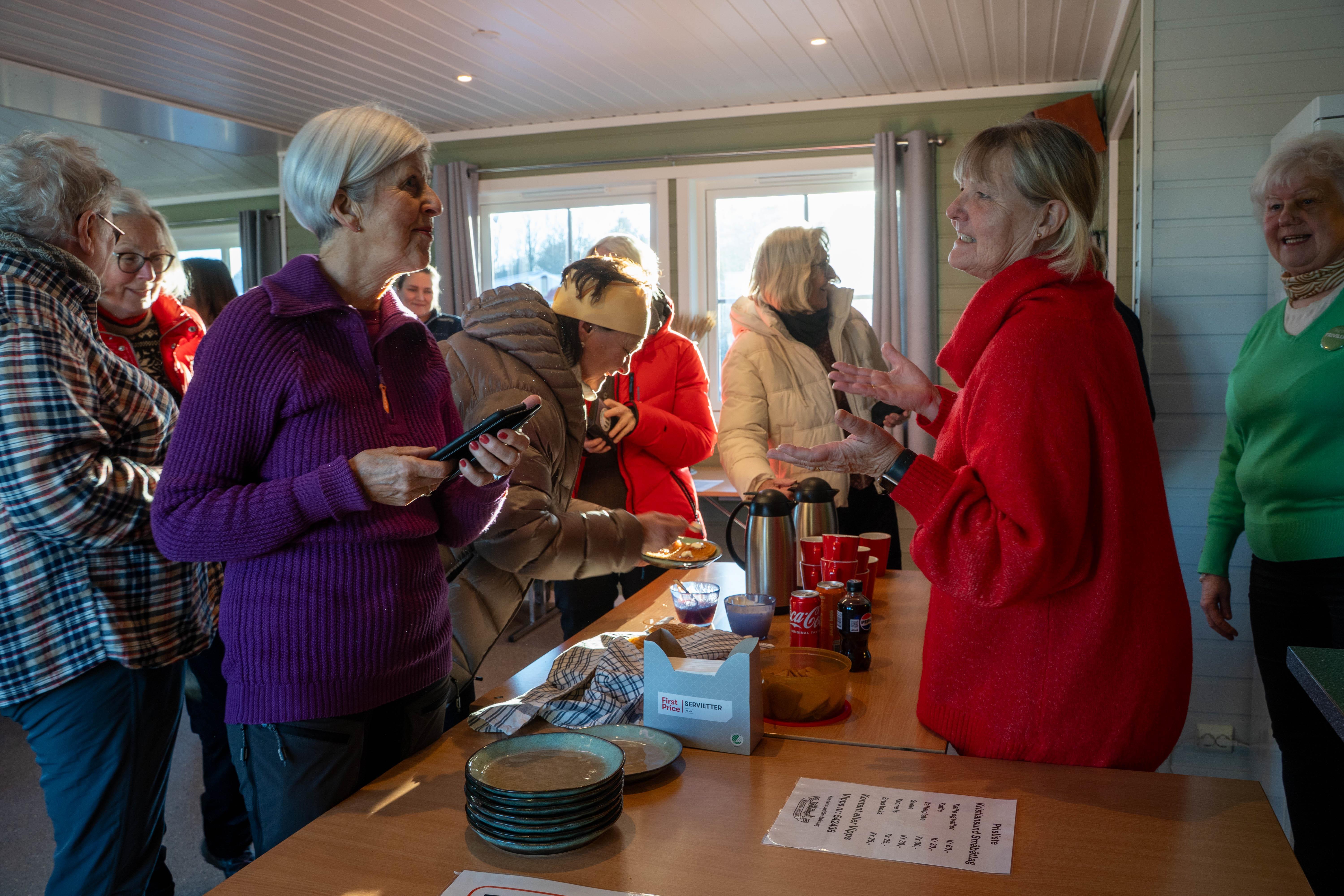 Dagny Betten (til venstre) sammen med Jorun Hals er de som denne dagen stekte vafler og kokte kaffe og holdt orden og snakket med alle de som kom inn denne flotte januardagen.