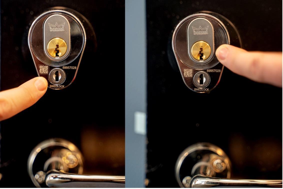 Her ser du et bilde av hvordan e-låsen vil se ut ferdig montert på ei dør. Til venstre pekes det på selve e-låsen. På bildet til høye pekes det på låsesylinderen der du skal bruke din vanlige nøkkel.