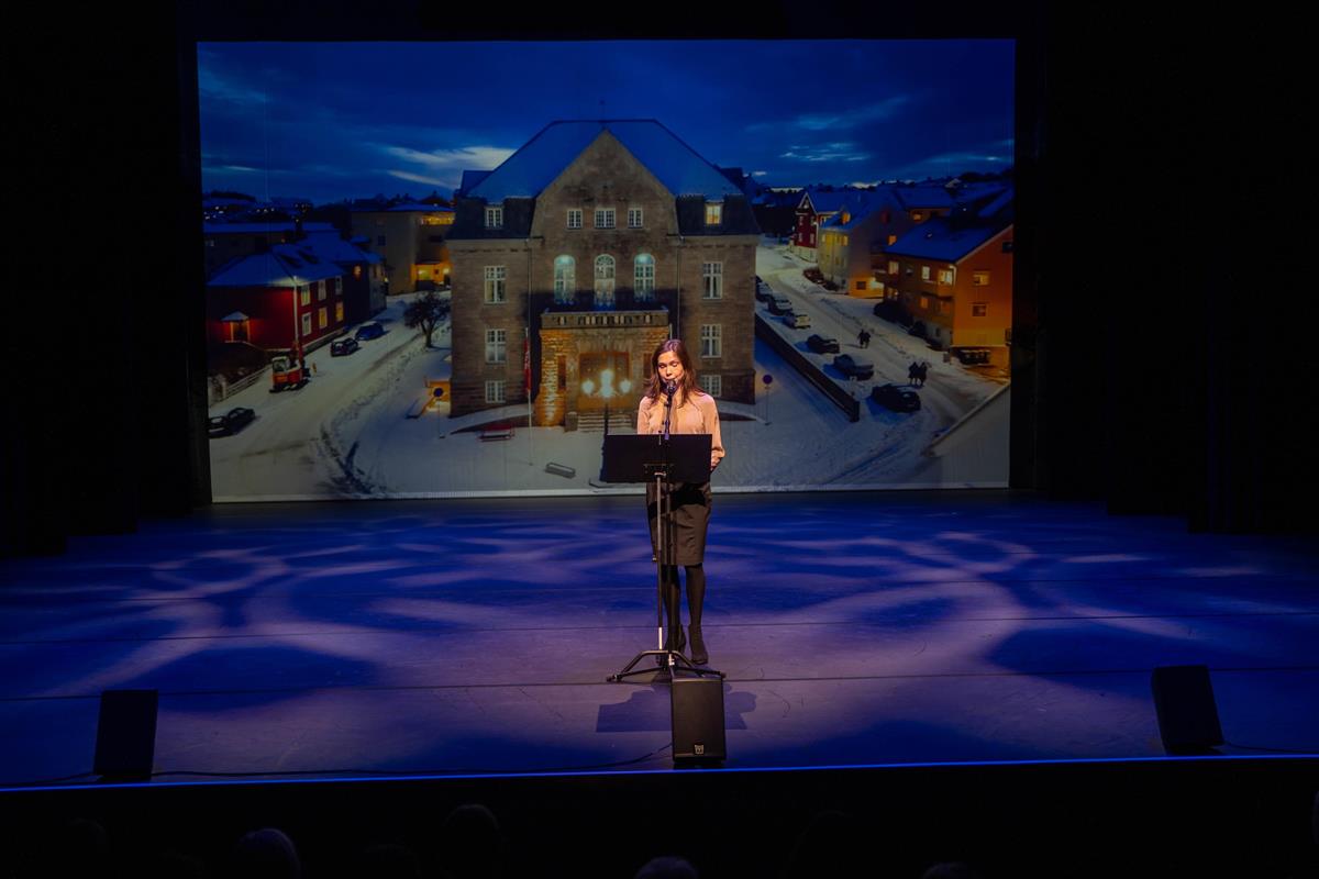 Forfatter Mette Karlsvik leste sitt eget stykke "Et brev til framtiden" på scenen i Normoria.