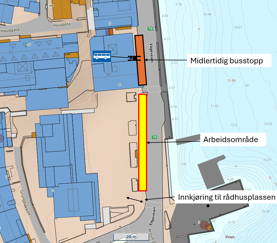 Olav Alvheim skal på oppdrag av Mellom AS utføre gravearbeid i busslommen utenfor Rådhuset. Som følge av arbeidet blir bussholdeplassen ved Rådhuset midlertidig stengt og flyttet til parkeringsplassene langs Vågeveien 4, ved Servicetorget.