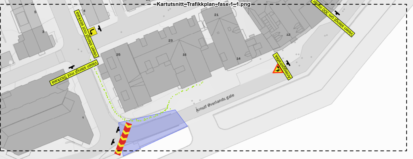 I forbindelse med dette vil Arnulf Øverlands gate stenges for gjennomkjøring i anleggsperioden. Skal du til REMA, Hotel Scandic eller Politiet vil du kunne kjøre dit som vanlig fra Langveisiden.