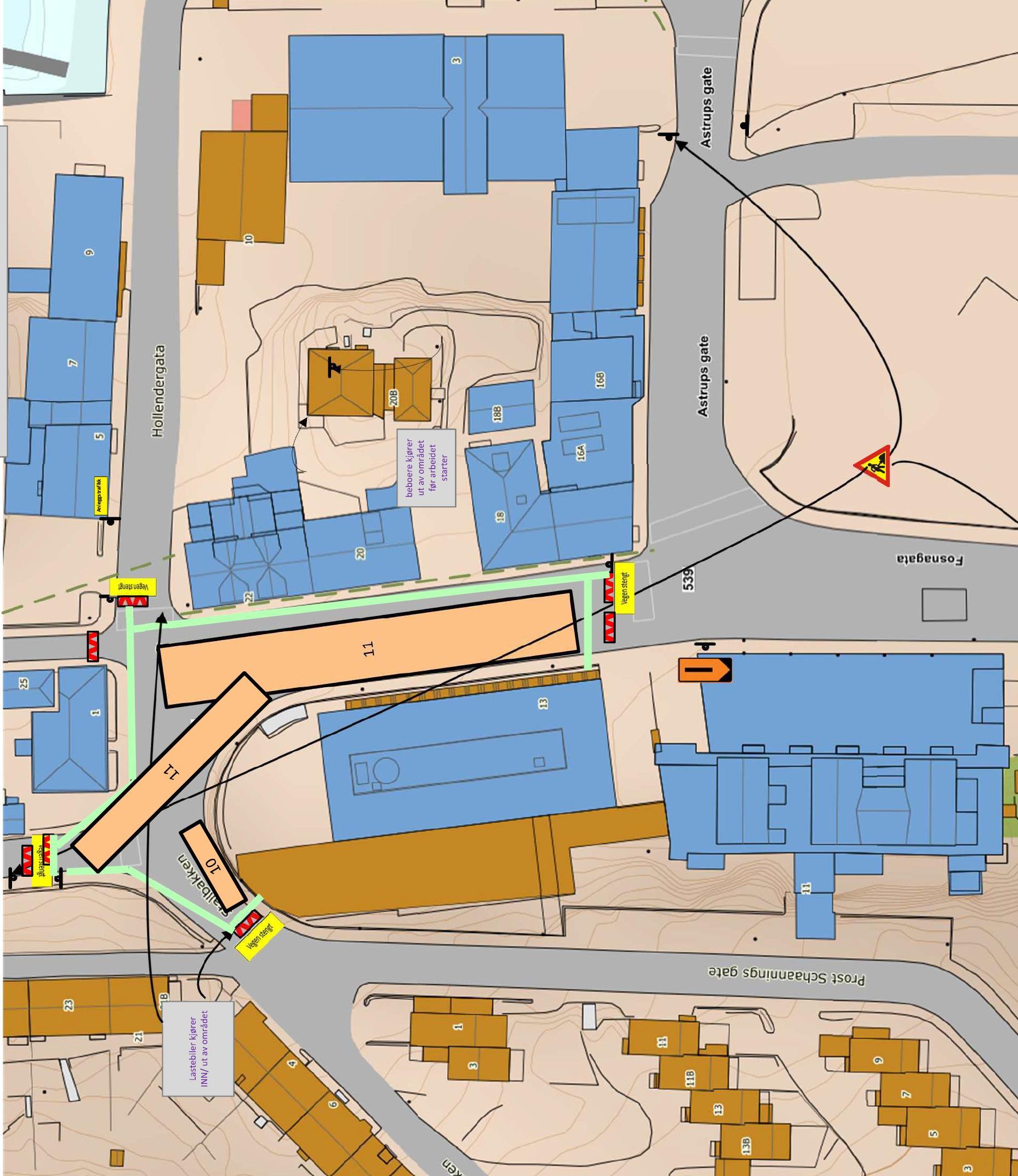 Stengingen gjelder frem til og med 3. mai, og vil berøre flere sentrale veier. Fylkesveg 539 og den kommunale veien Stallbakken/Prost Schaannings gate (KV9450) blir direkte påvirket. I tillegg er Hollendergata allerede stengt, noe som betyr at totalt fire gater inn mot krysset vil være utilgjengelige i perioden.