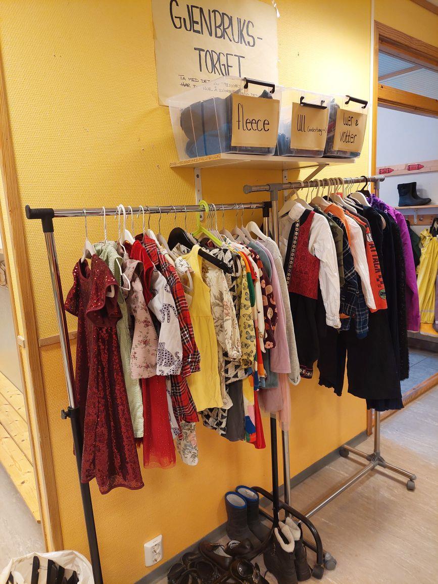 Ved inngangen til SFO, har vi en god stund nå hatt Gjenbrukstorget. En kjempefin mulighet for alle til å bli kvitt klær og sko til barn som ikke lenger er passelig, men som kan være akkurat det noen andre trenger til sine barn. Ser du noe som henger på stativet som ditt barn kan ha nytte av, er det bare å ta det med deg :)