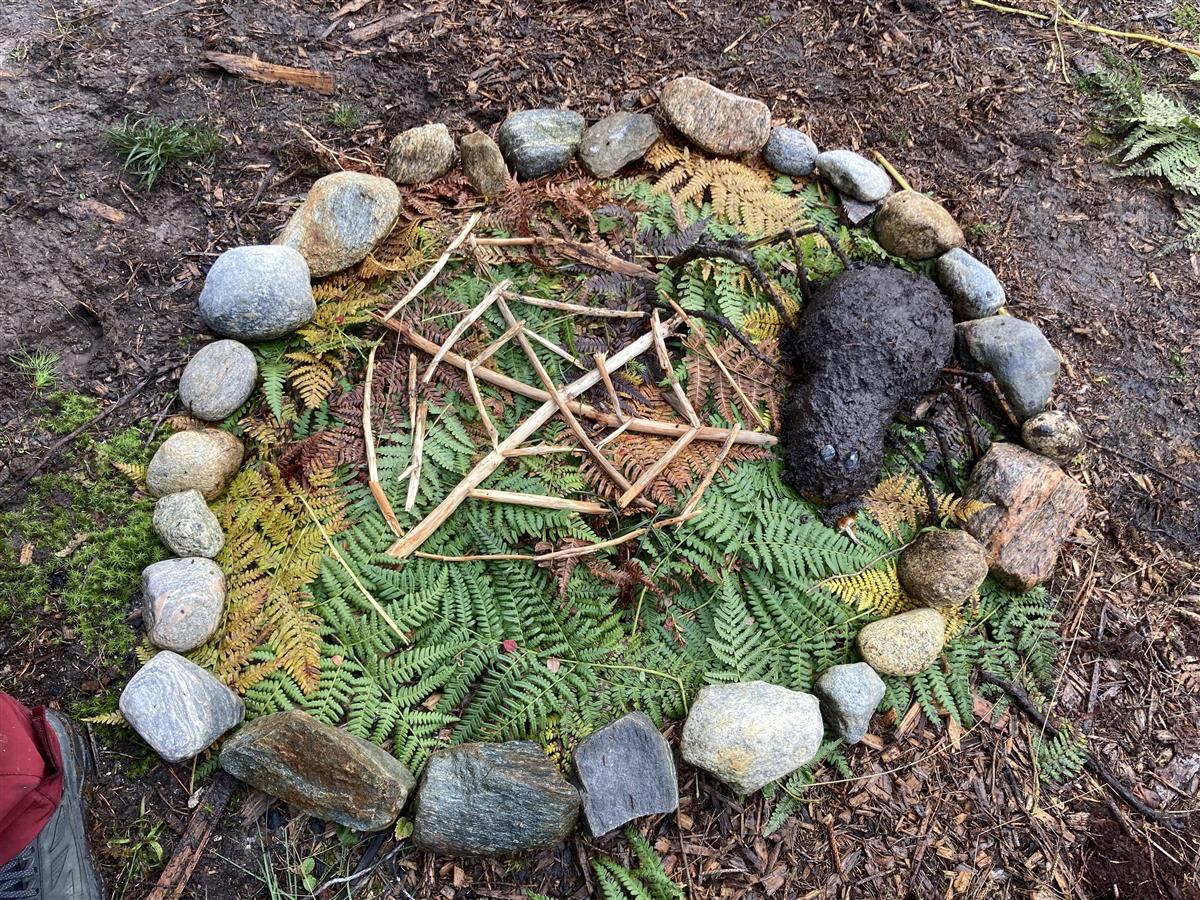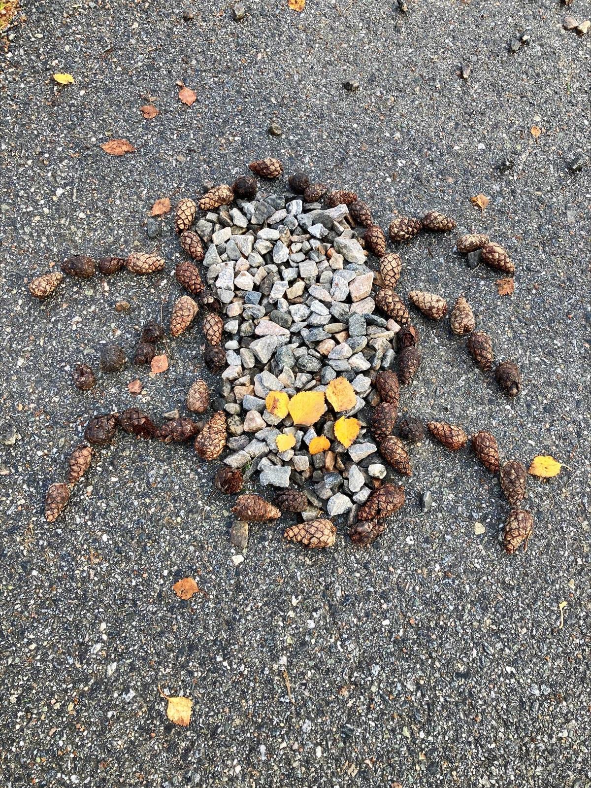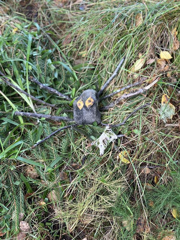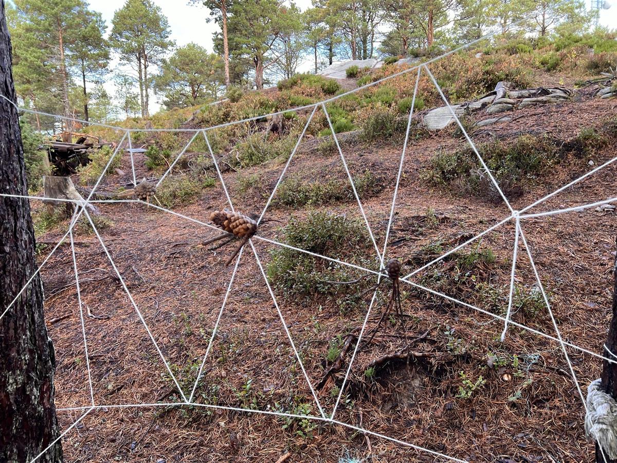 Hele skolen hadde også uteskole en dag, der vi gjennomførte et opplegg som heter "Kongle for en dag". Da ble det laget landart i nærområdet med temaet "edderkopper i skogen".