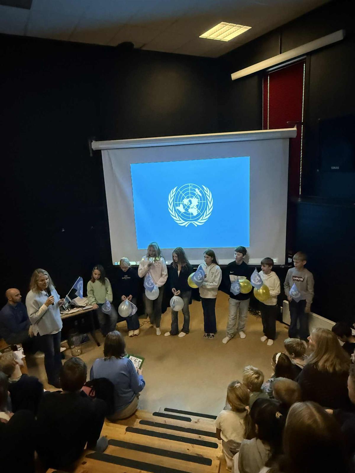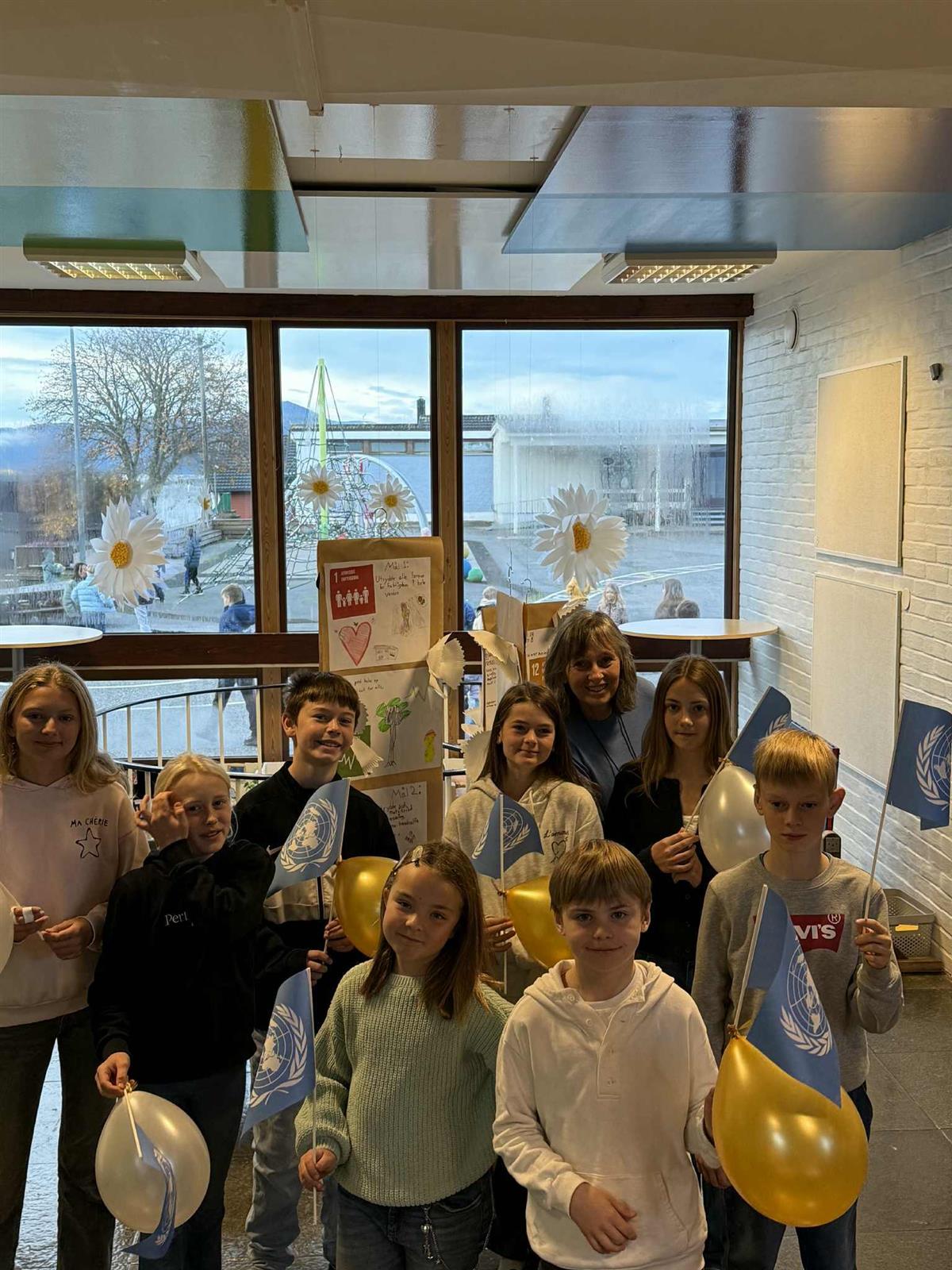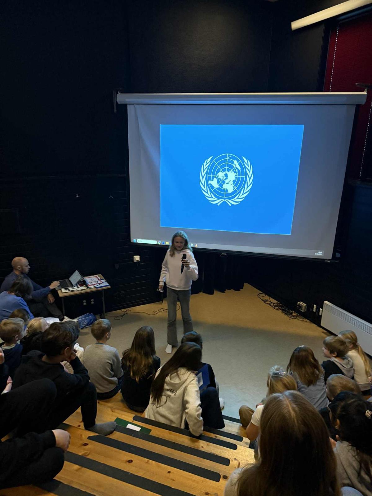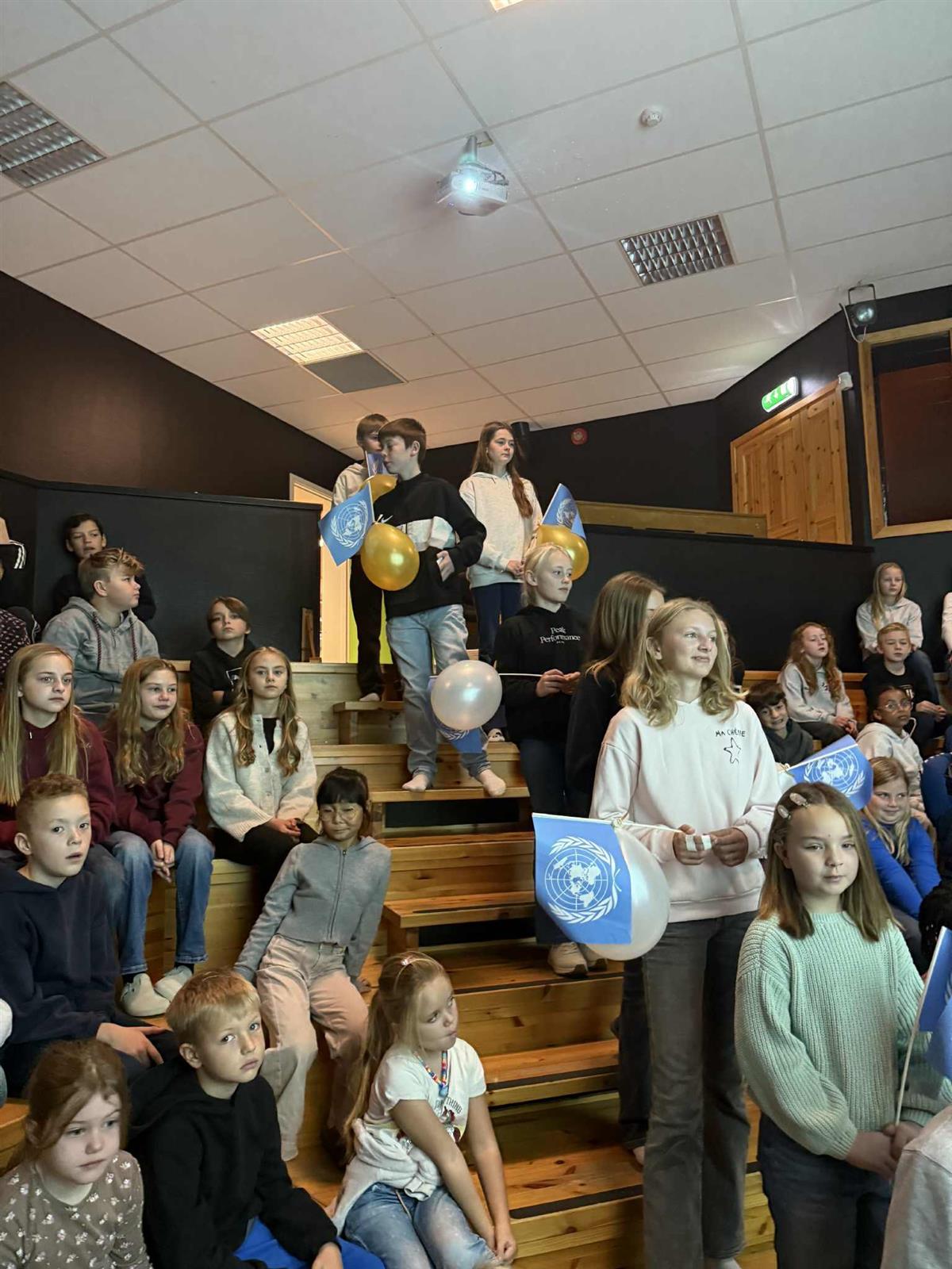 Elevrådet, med Vibeke i spissen, har de siste ukene forberedt markeringen av FN-dagen. Dagen startet med flaggheising og en flott appell lest av elevrådet. Etterpå samlet hele skolen seg i amfiet, der elevene presenterte FNs bærekraftsmål og fremførte sang. Det ble en fin og høytidelig markering av en viktig dag.
