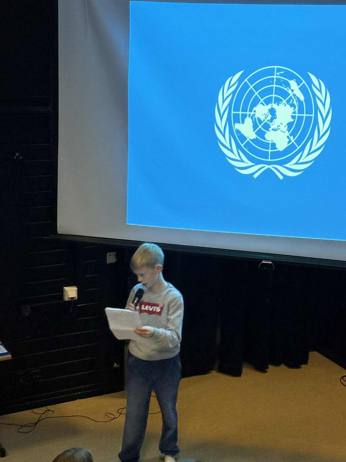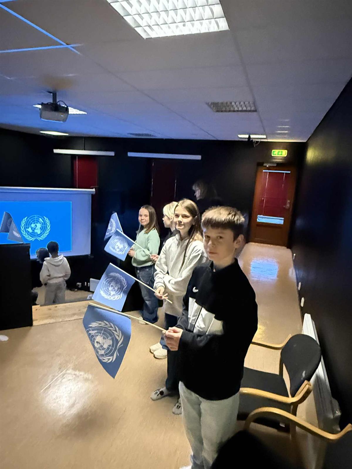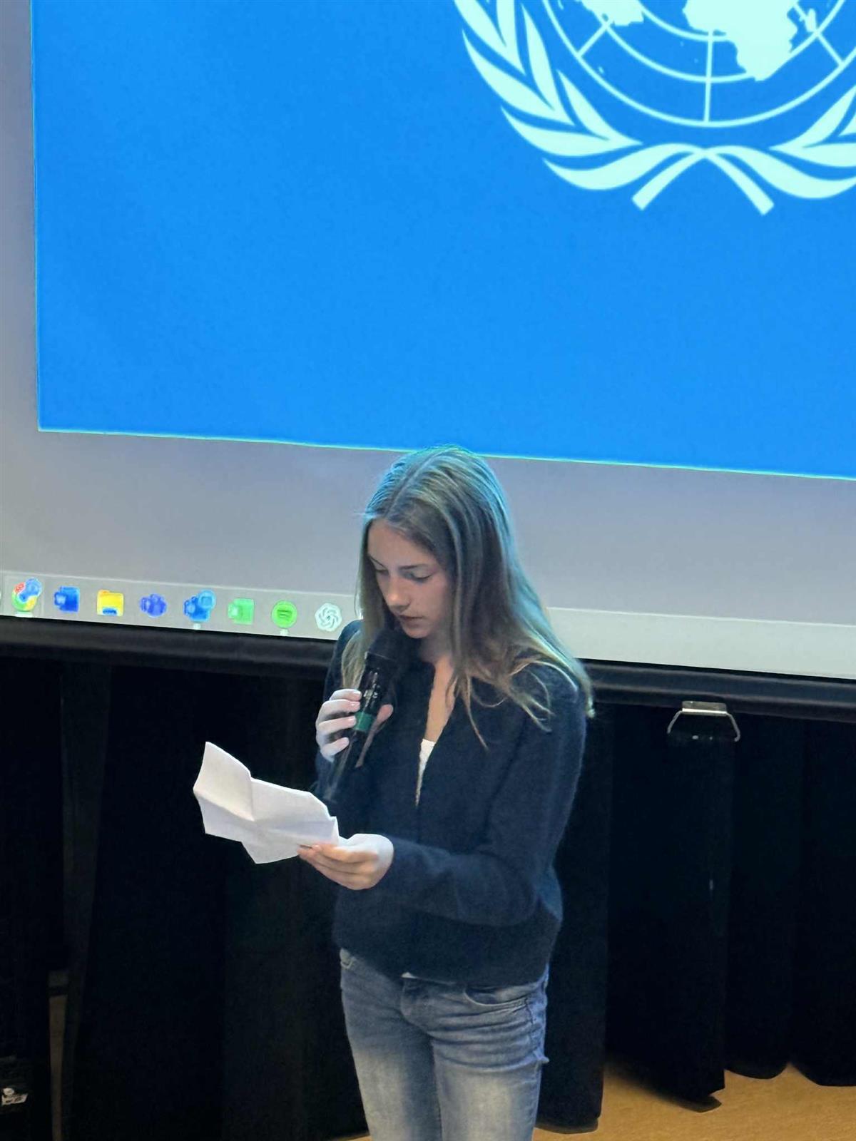 Elevrådet, med Vibeke i spissen, har de siste ukene forberedt markeringen av FN-dagen. Dagen startet med flaggheising og en flott appell lest av elevrådet. Etterpå samlet hele skolen seg i amfiet, der elevene presenterte FNs bærekraftsmål og fremførte sang. Det ble en fin og høytidelig markering av en viktig dag.