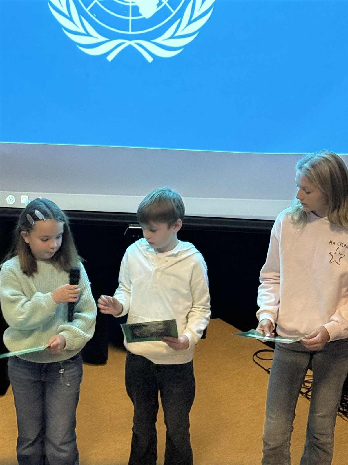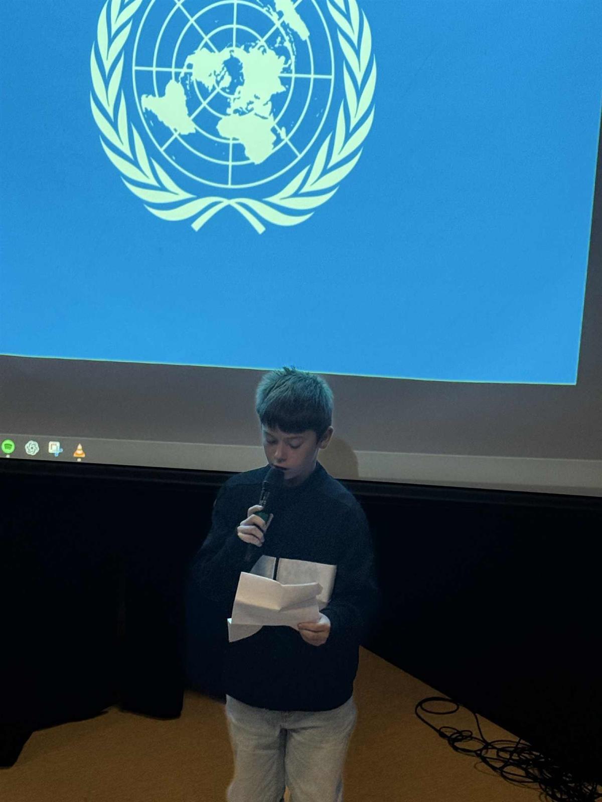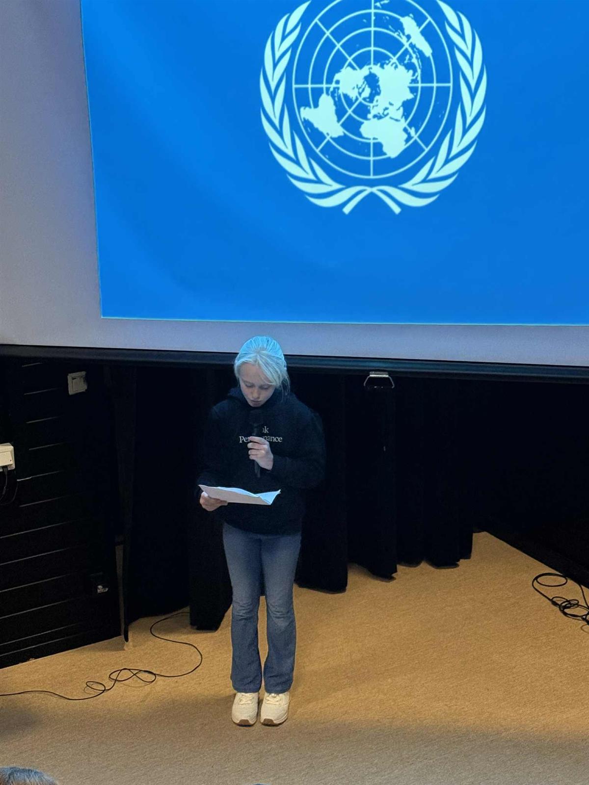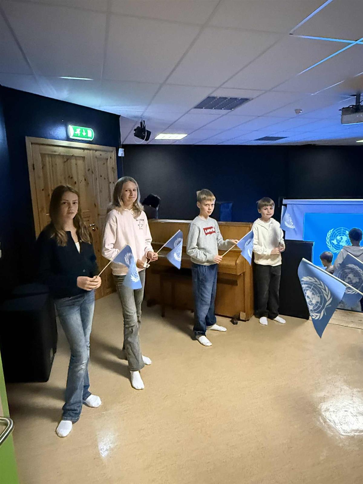 Elevrådet, med Vibeke i spissen, har de siste ukene forberedt markeringen av FN-dagen. Dagen startet med flaggheising og en flott appell lest av elevrådet. Etterpå samlet hele skolen seg i amfiet, der elevene presenterte FNs bærekraftsmål og fremførte sang. Det ble en fin og høytidelig markering av en viktig dag.