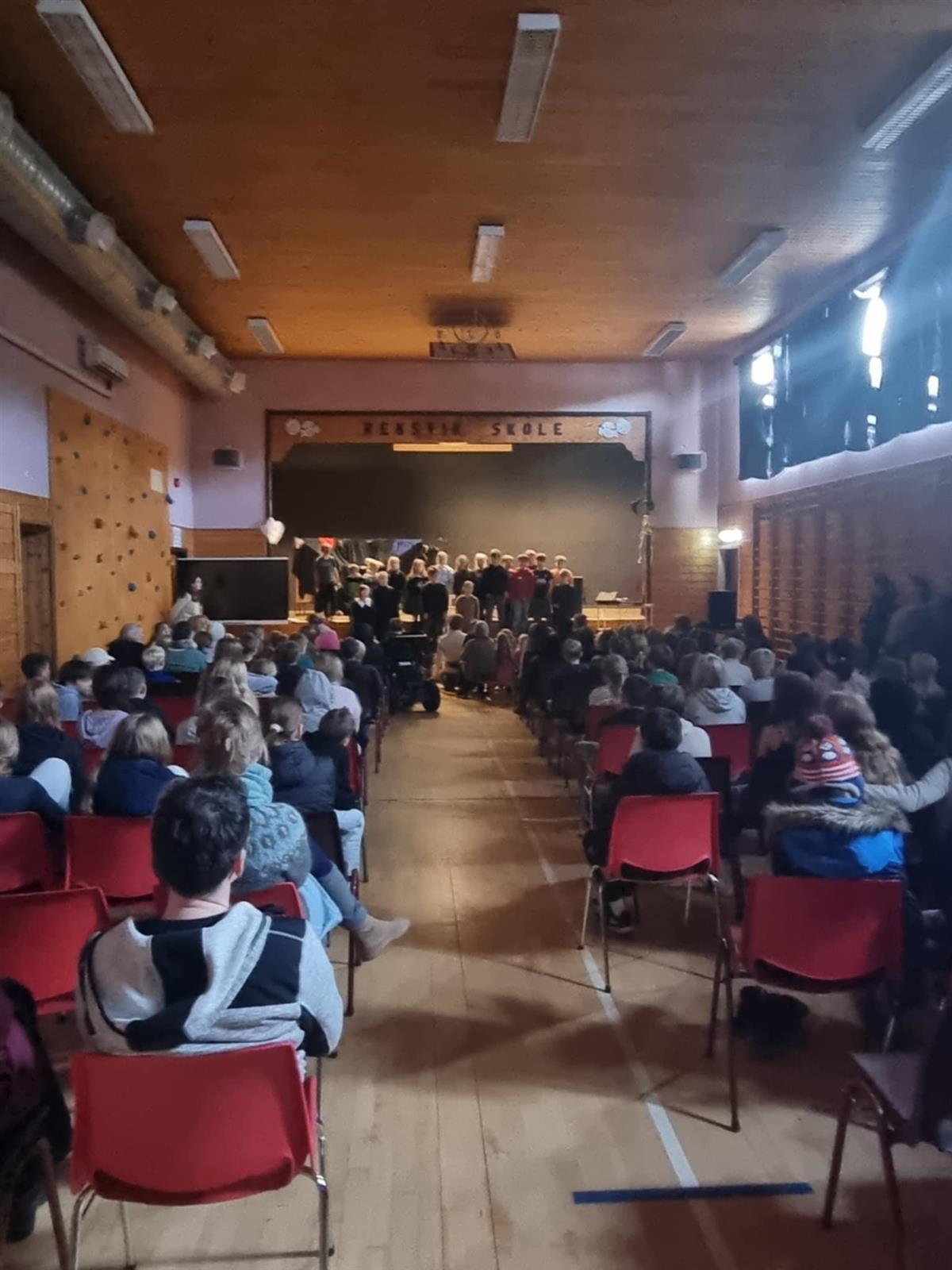 Bilde fra enden av gymsalen mot 4. trinnet som underholder.